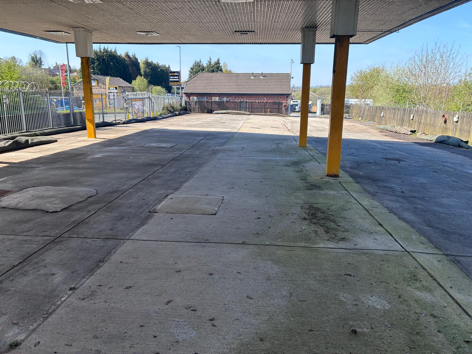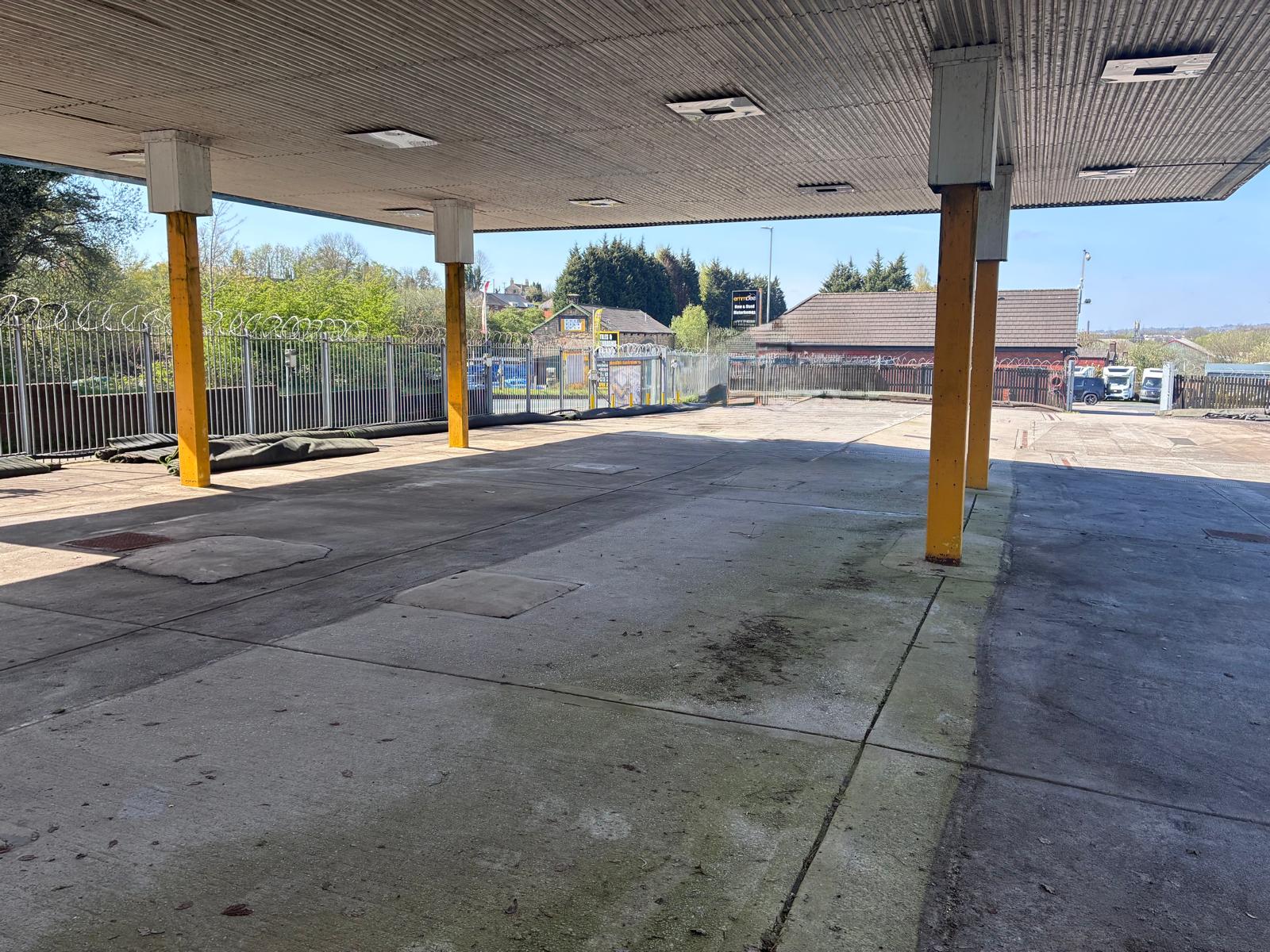 Externally, there is a fenced and gated forecourt, partially covered with a canopy. To the rear is an additional fenced